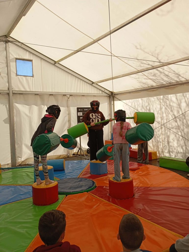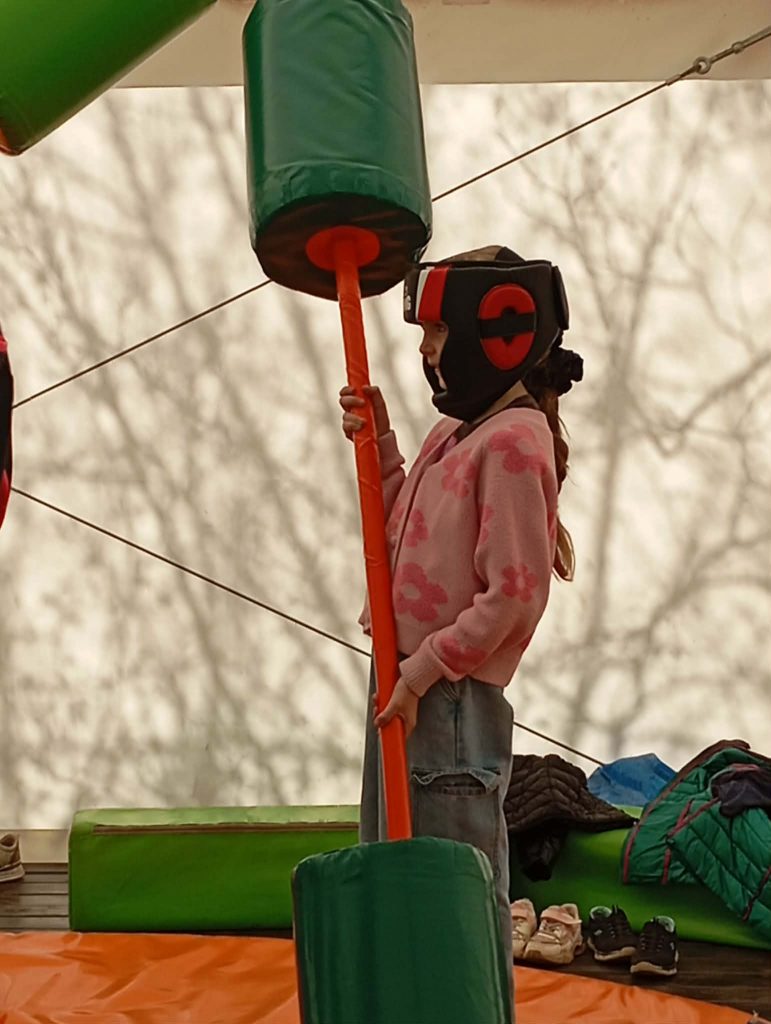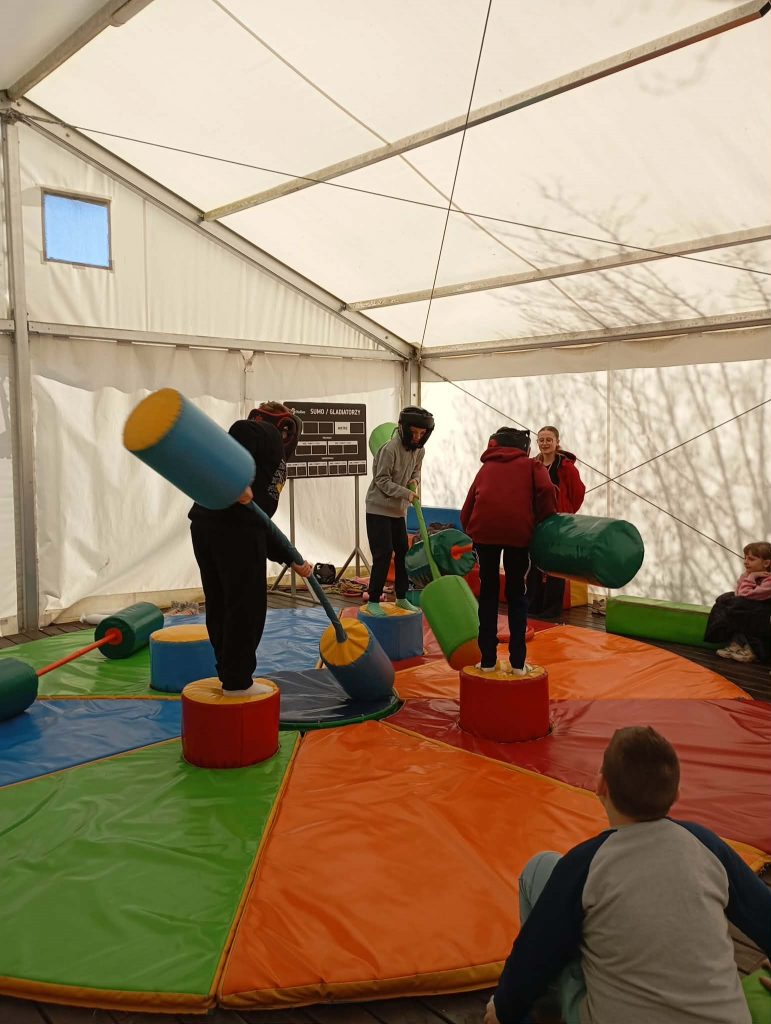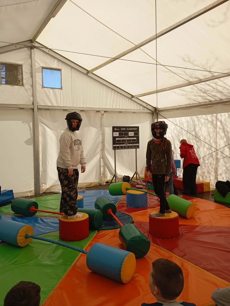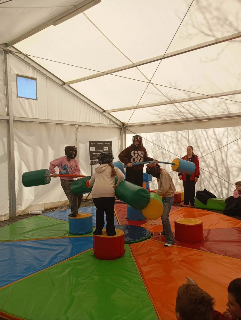 Drugi dzień rozpoczęliśmy od wspólnego śniadania, które dodało nam energii na kolejne atrakcje. Zaraz potem czekały na nas emocjonujące walki gladiatorów – mogliśmy poczuć się jak w starożytnym Rzymie i spróbować swoich sił w tej nietypowej rywalizacji. Następnie wzięliśmy udział w zajęciach survivalowych, podczas których uczyliśmy się przydatnych umiejętności radzenia sobie w terenie. Dużo radości dostarczyła także ścianka wspinaczkowa, gdzie każdy mógł sprawdzić swoją sprawność i odwagę.