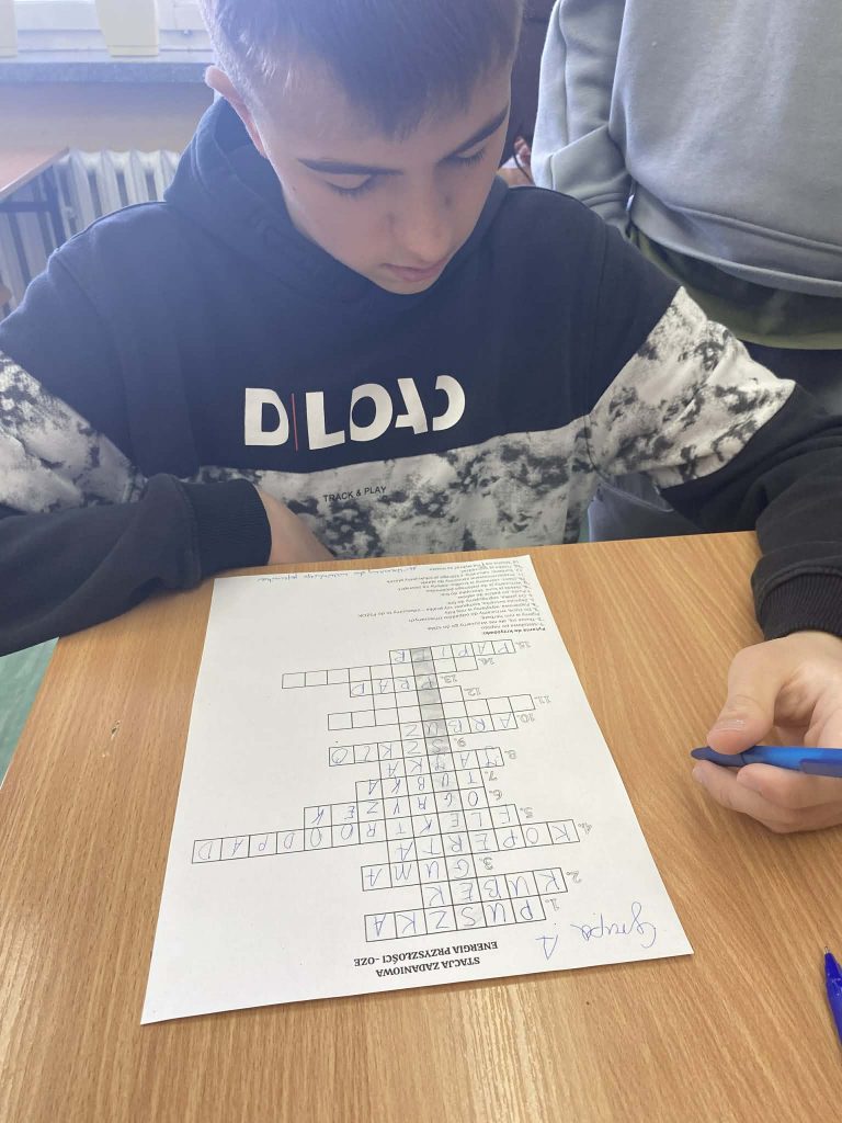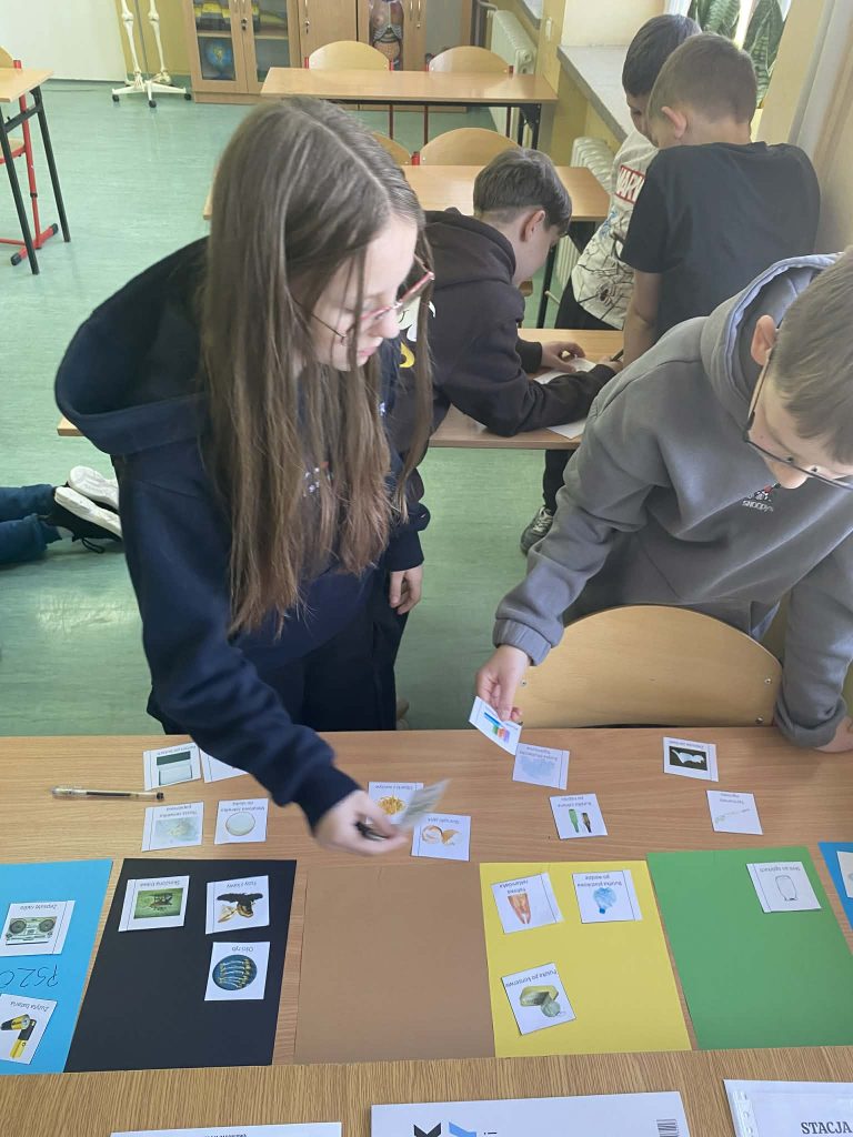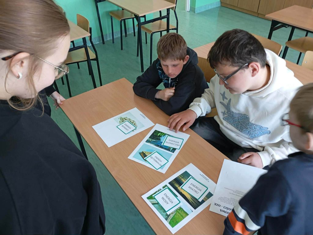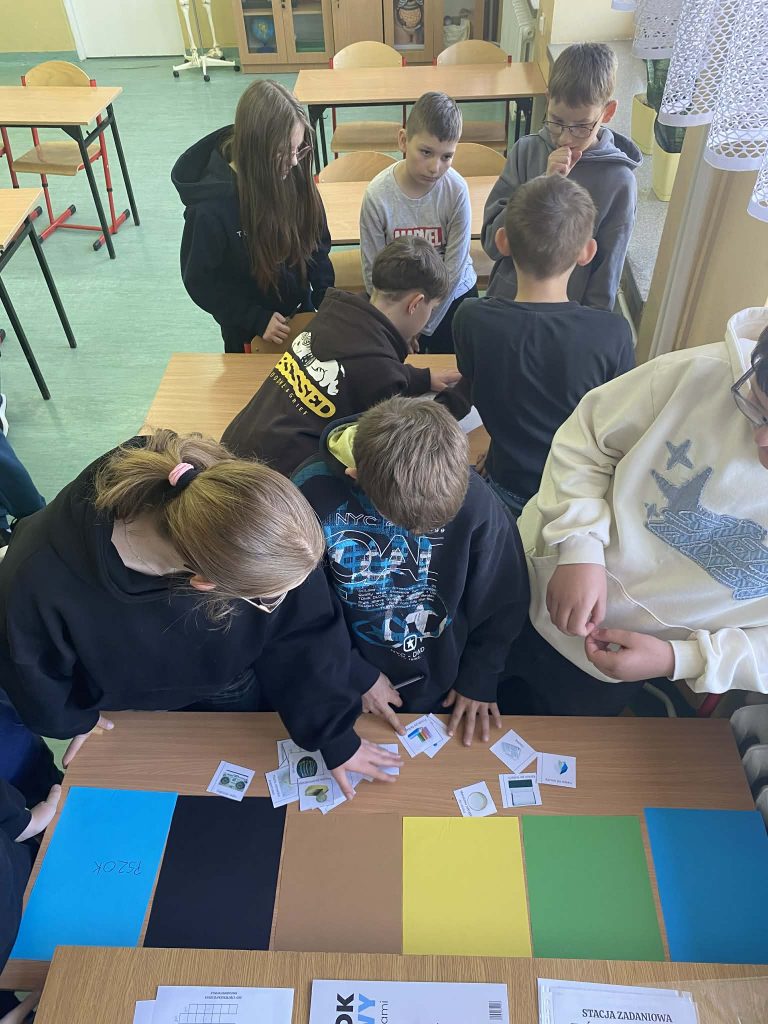 Na stacji o energii uczniowie rozwiązywali zagadki dotyczące oszczędzania prądu, wskazywali, które działania zmniejszają zużycie energii w domu i w szkole.