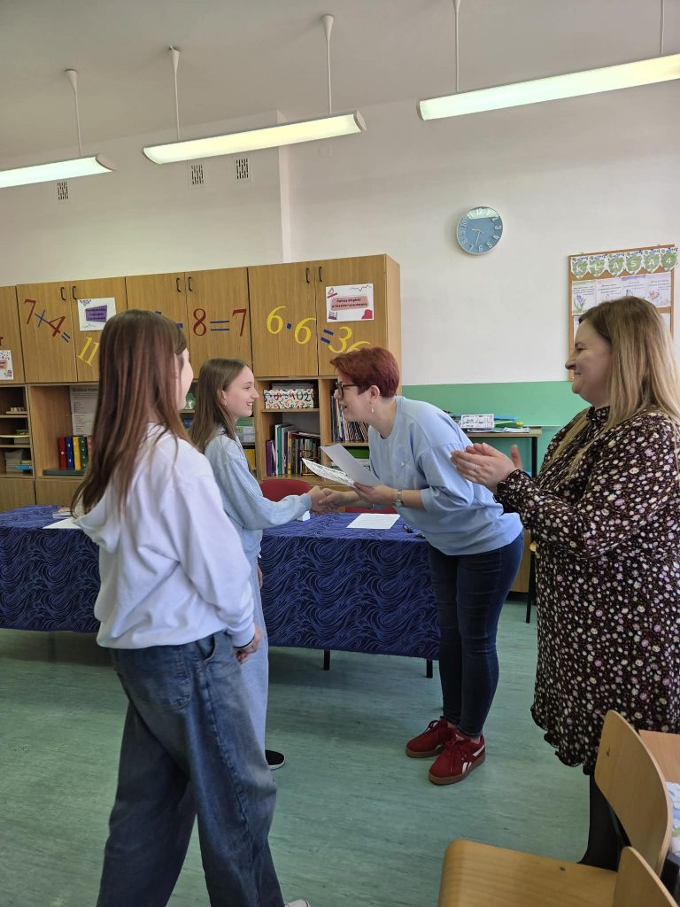 Największe wrażenie zrobiły Alina D. (kl. V) i Oliwia W. (kl. VII), które zdobyły I miejsce, recytując aż 204 cyfry rozwinięcia liczby π! Ich występ został nagrodzony gromkimi brawami i wzbudził podziw wśród zgromadzonych. Pozostałe dziewczynki: Lena K., Nikola M. zajęły kolejne miejsca: II i III.