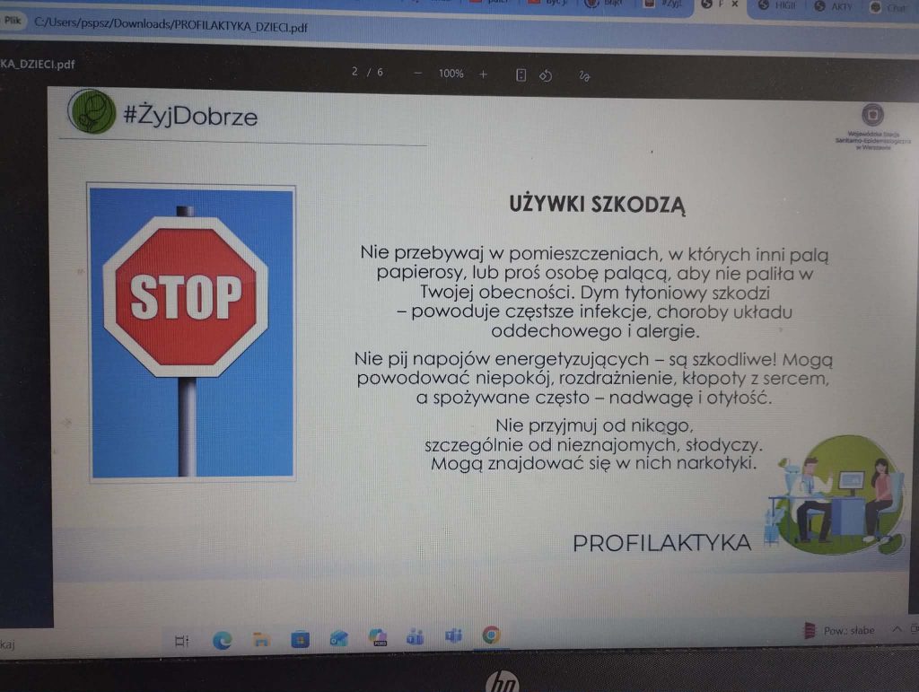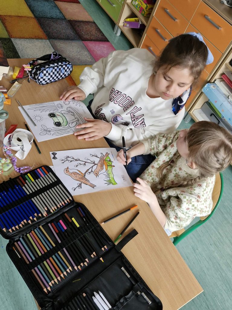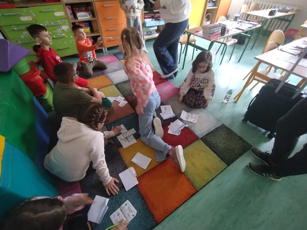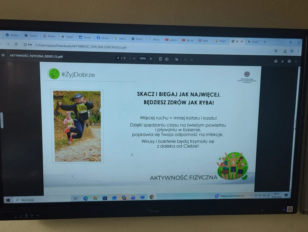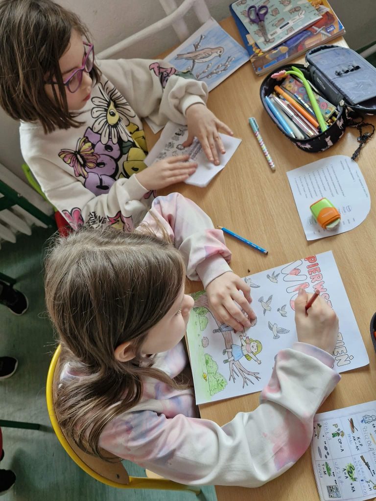 Po powrocie do szkoły uczniowie uczestniczyli w prelekcji realizowanej w ramach programów „Żyj dobrze” oraz „Zachowaj trzeźwy umysł” oraz z zakresu dietetyki żywieniowej. Podczas spotkania omówiono najważniejsze filary zdrowego stylu życia, zwracając uwagę na znaczenie aktywności fizycznej, odpowiedniego odżywiania oraz dbania o dobre samopoczucie. Młodsze dzieci dodatkowo rozwiązywały quizy i wykonywały kolorowanki związane z wiosną i ochroną przyrody. ![]()