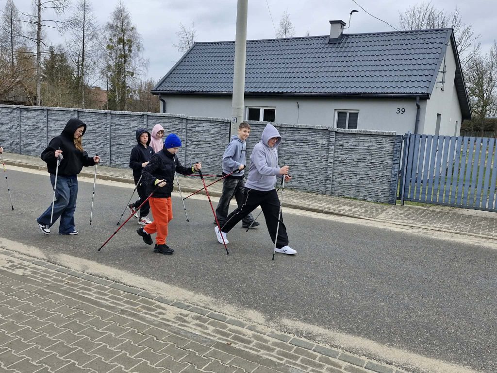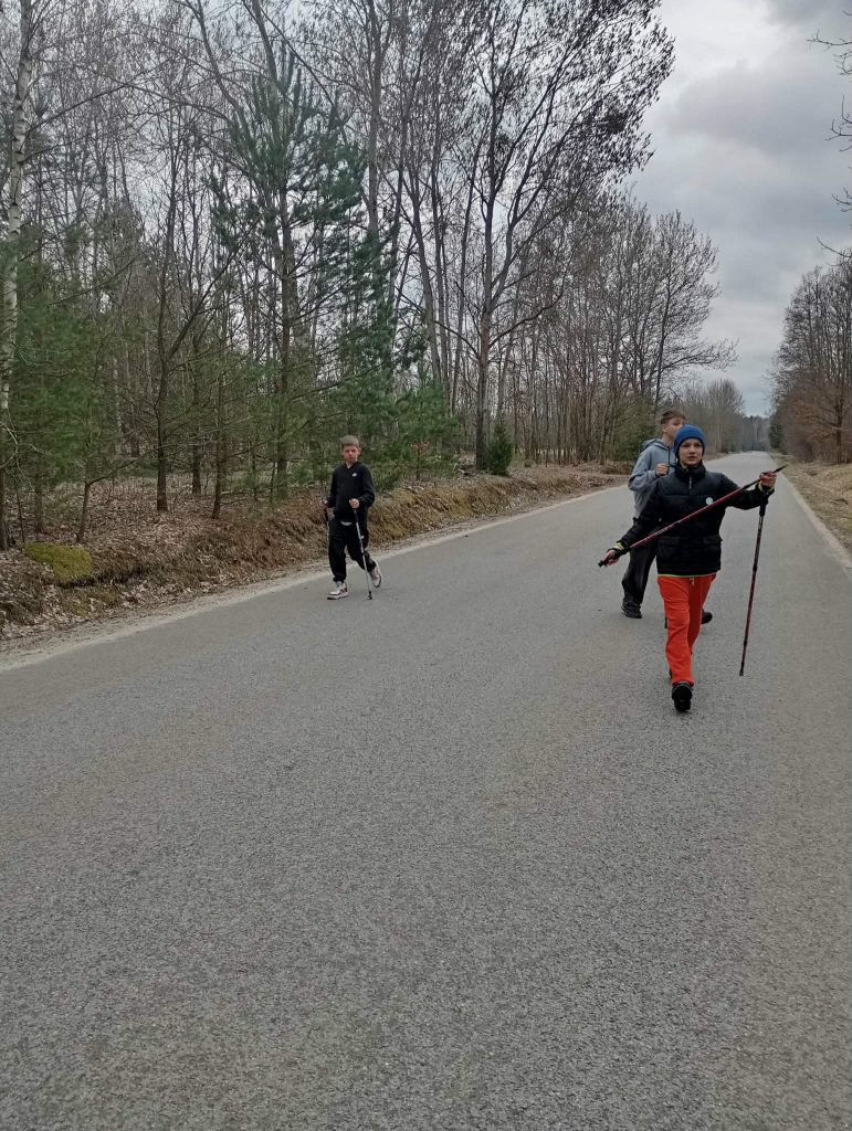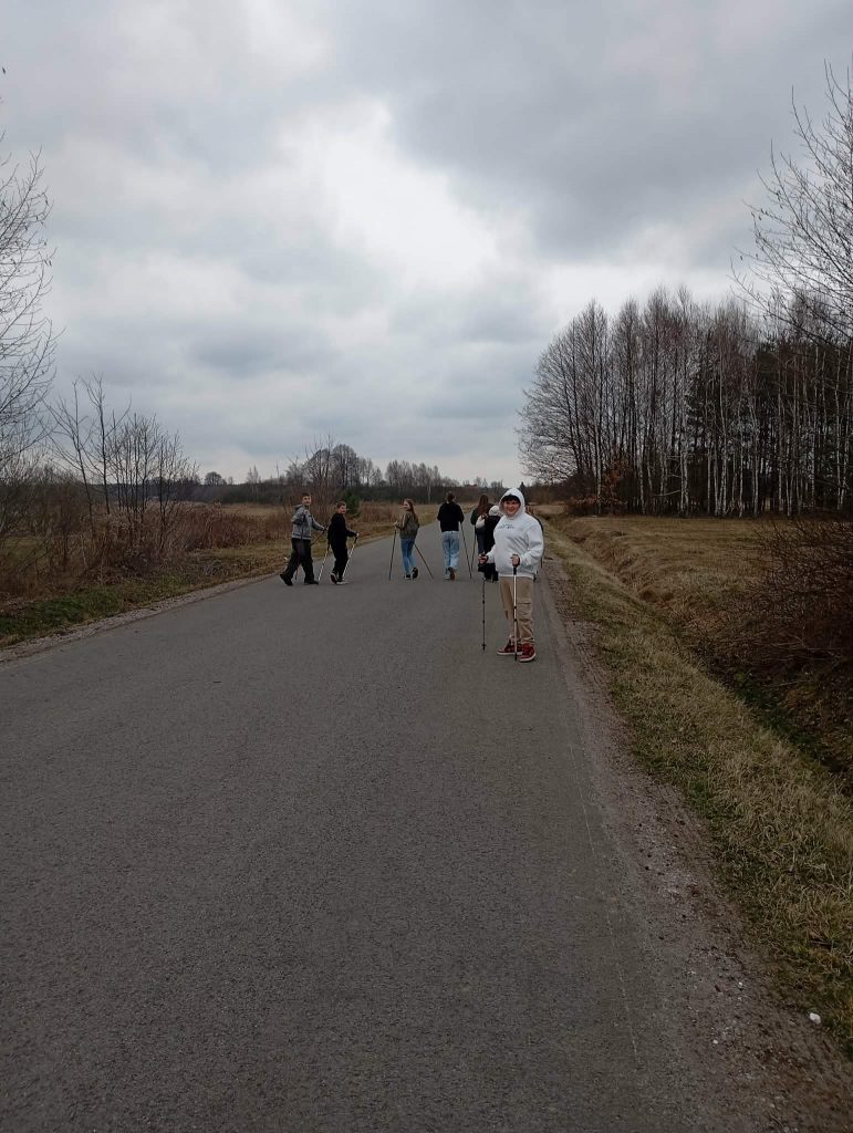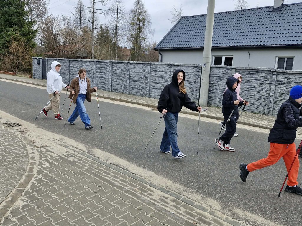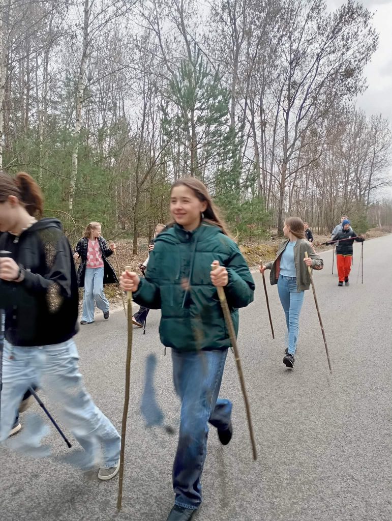 Kolejnym punktem programu był podział na grupy i wyjście na świeże powietrze. W ramach aktywności fizycznej uczniowie udali się na spacer w poszukiwaniu pierwszych oznak wiosny. Część uczestników wybrała marsz z kijkami, inni natomiast spacerowali w spokojniejszym tempie, obserwując przyrodę i ciesząc się coraz cieplejszą aurą.