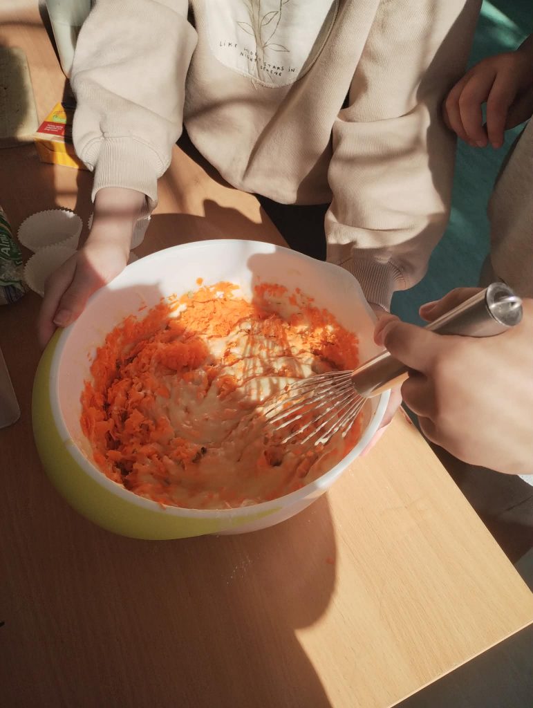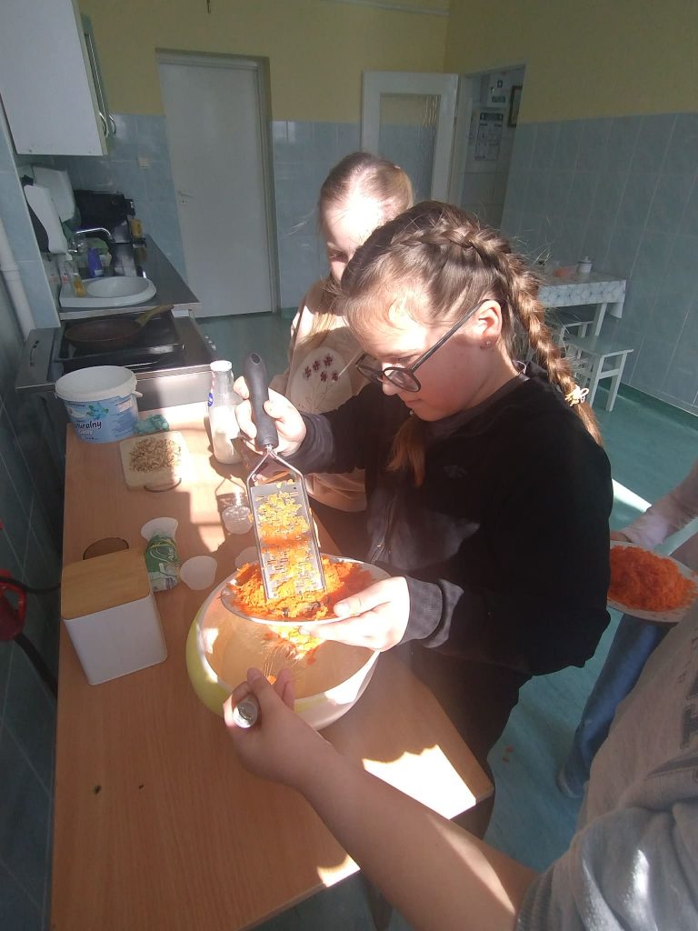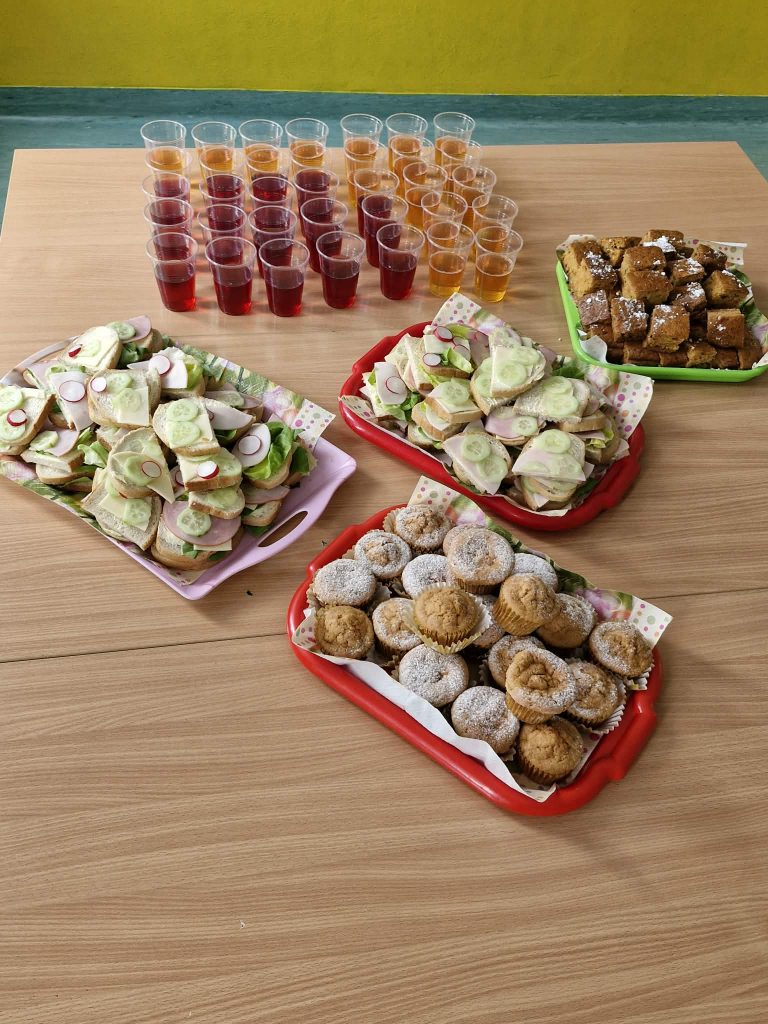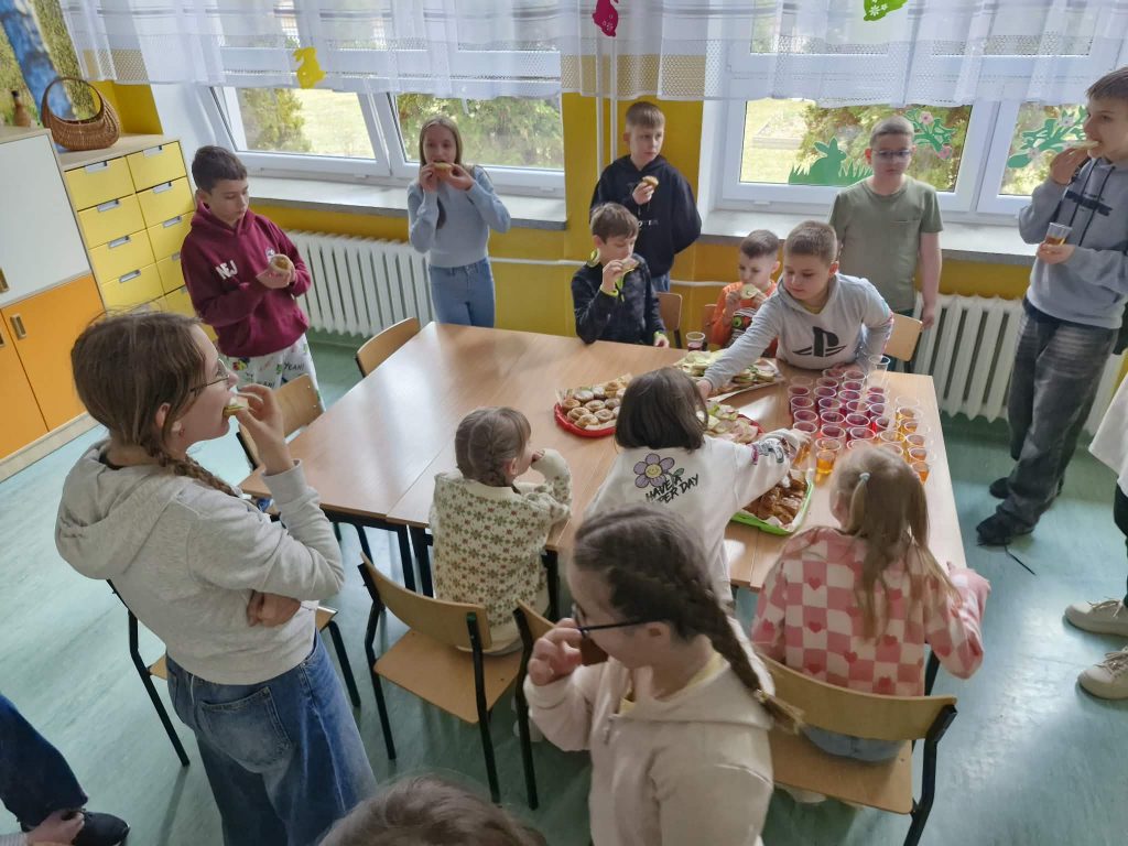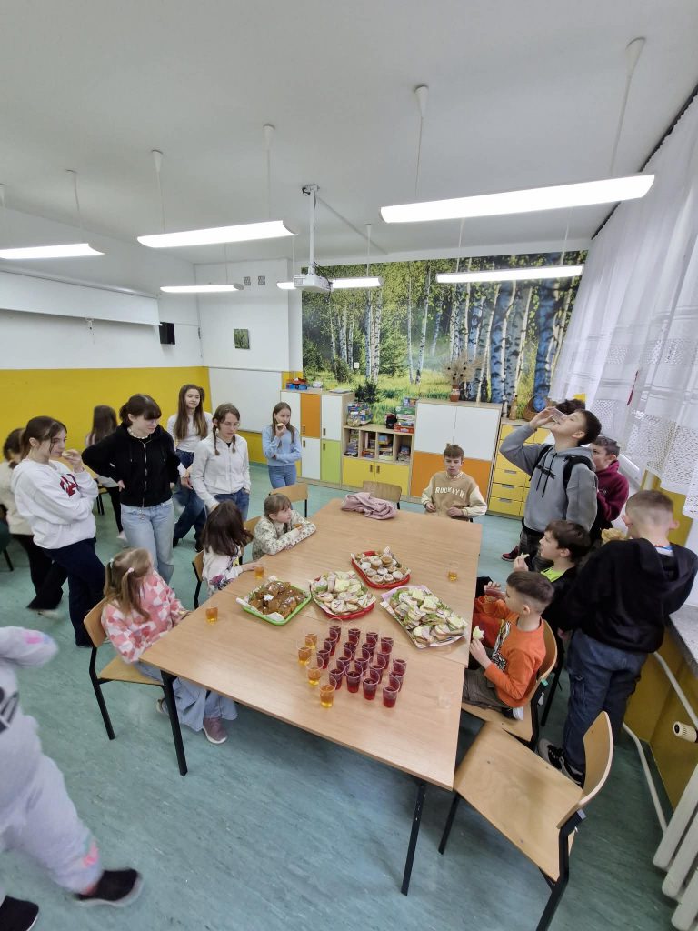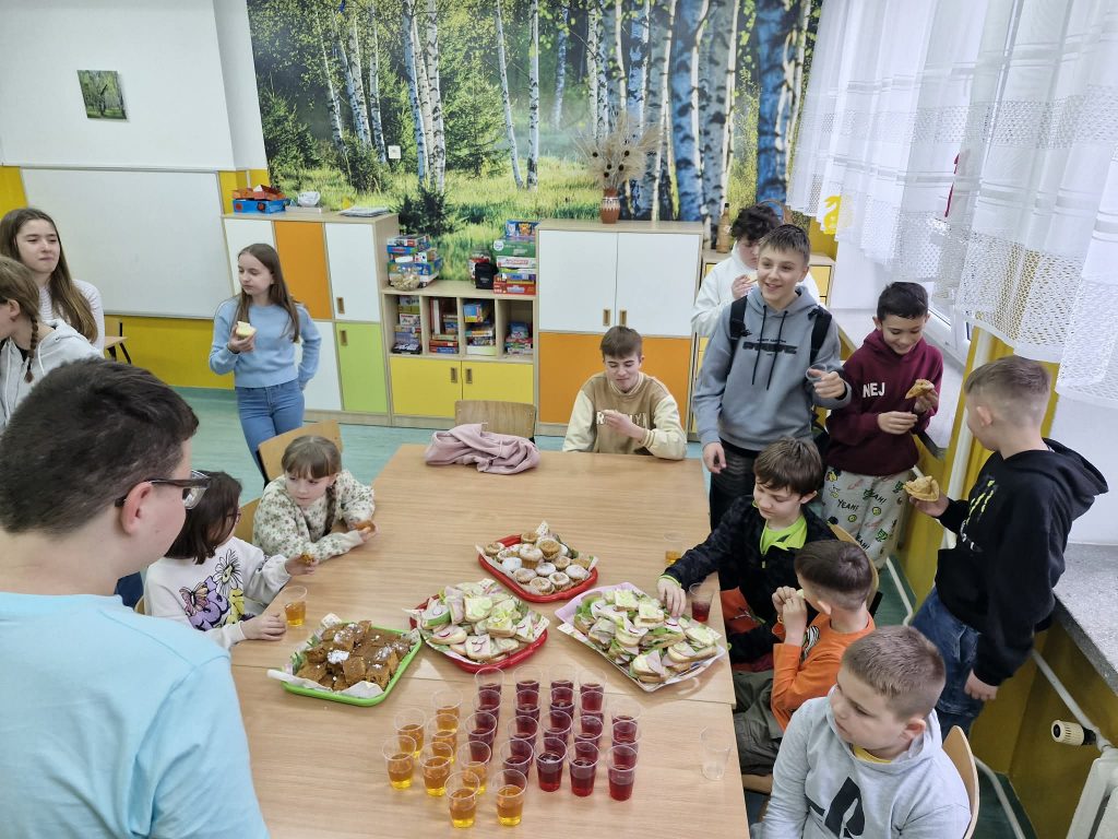 Następnie przyszedł czas na wspólny, zdrowy posiłek. Na stołach pojawiły się wiosenne kanapki pełne świeżych warzyw, a także słodkości w postaci ciasta przygotowanego przez uczennice z klasy 3. Nie zabrakło również soków owocowych, które stanowiły smaczne i zdrowe uzupełnienie posiłku.